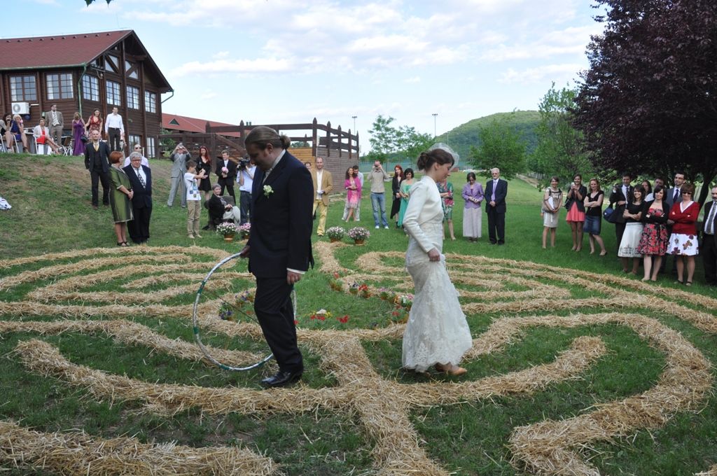 Megkerestük Halász Pétert, aki labirintusok építésével és labirintusjárás vezetésével foglalkozik, és megkértük, hogy segítsen nekünk az esküvői szertartáshoz szükséges szalmalabirintus elkészítésében. Péter javasolta, hogy egy afrikai alakzatot, a "megbékélés labirintusát" használjuk. Igaz, ezt eredetileg haragosok összebékítésére alkalmazzák, de tágabb értelemben két ember találkozását és közös útját is szimbolizálja, így nekünk éppen megfelel. A gondos építő azt is figyelembe veszi, milyen anyagból dolgozik, hiszen egy szertartáson minden szimbólumnak fontos szerepe van. Építőanyagnak a helyszínen beszerezhető szalmát és rengeteg virágot használt. A szalma szimbolizálja a növekedést, termékenységet, az éltető Napot, így jól illik az esküvőhöz. Péter arra is vállalkozott, hogy a szertartást levezesse.