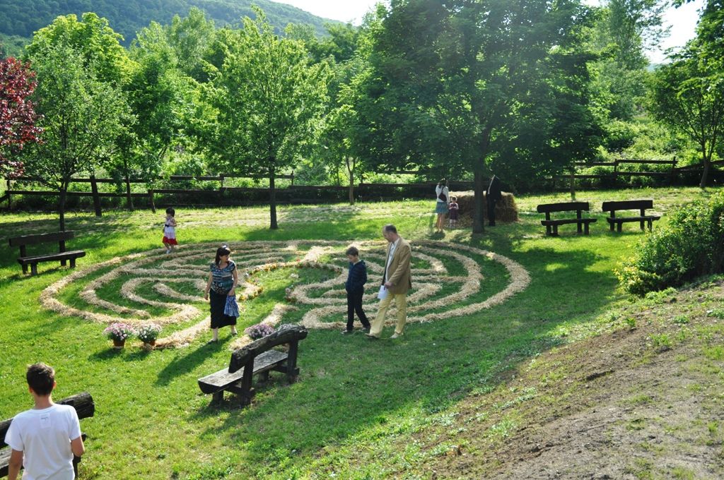 "Olyan volt, mint amikor a megismerkedésünkkor mindent elmeséltünk egymásnak magunkról, az addigi életünkről. Eszembe jutott a Kékszakállú herceg vára, amikor Judit benyit minden ajtón, lát minden boldog percet, kincset, és látja a szenvedést, a sötét órákat is. Végtelen hálát éreztem, amiért mindezt megmutatja nekem. Végül az utunk összefonódott, mi is egymásba kapaszkodtunk és úgy léptünk be az alakzat középpontjába. Éreztem a keze szorításából, hogy ő is mélyen átélte az elmúlt perceket és örül, hogy most már együtt folytatjuk az utat. A középpontban kaptuk az igazi beavatást: régi kedves ismerősöm, Boldizsár Ildikó meseterapeuta elmondott nekünk egy mesét, ami mintha pontosan rólunk szólt volna. Olyan mélyen megérintett mindkettőnket, hogy potyogtak a könnyeink. Végül Pétertől is kaptunk egy labirintusmedált (a chartes-i labirintus alakzattal) és egy kagylót útravalóul, majd kijöttünk. Mindketten módosult tudatállapotban voltunk, nagyon erős katarzist éltünk meg, ami egyszerre volt felemelő és súlyos, így kellett negyed óra szünet kettesben. Sétáltunk és könnyeztünk, nevettünk a szabad ég alatt - amíg a násznép a vacsorához készülődött. (A vendéggyerekek pedig boldogan rohangáltak a labirintusban, ami innentől szabadon bejárható volt mindenki számára)."
